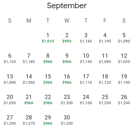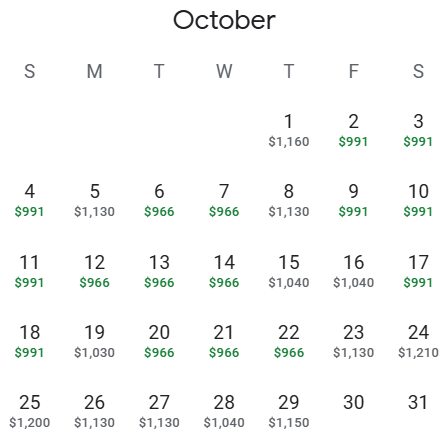 4. In the calendar view, search for departure dates starting in May 2026 and you will see which return dates have the lowest prices highlighted in green.