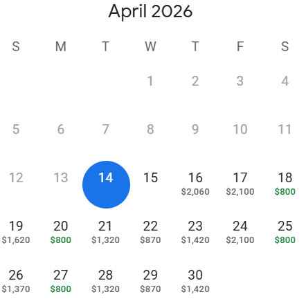 4. In the calendar view, search for departure dates starting in April 2026 and you will see which return dates have the lowest prices highlighted in green.