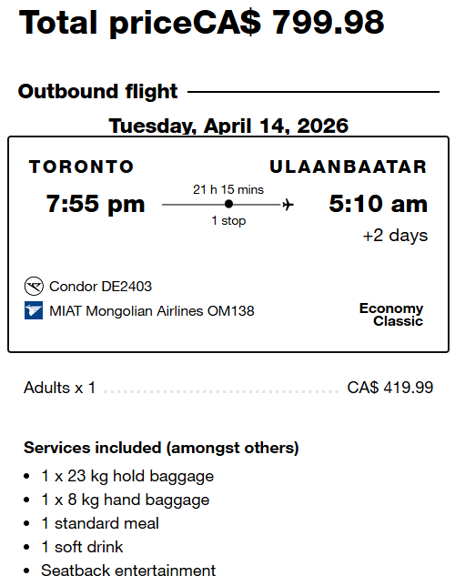 Toronto to Ulaanbaatar, Mongolia for $800 roundtrip (70% off!) – Spring 2026