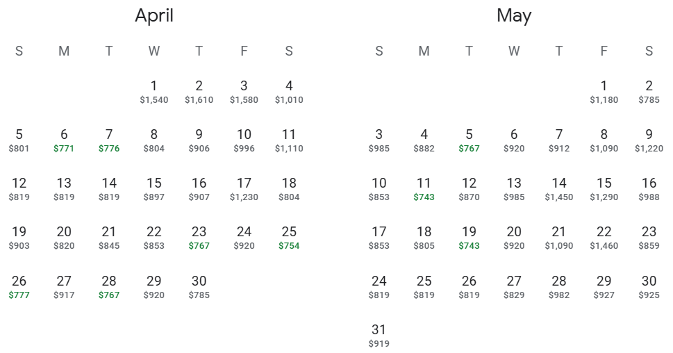 4. In the calendar view, search for departure dates starting in May 2026 and you will see which return dates have the lowest prices highlighted in green.